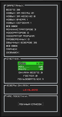 Красивая статистика для сайта ucoz, была создана для сайтов в темных цветах! Установка: 1. Создаем информер: [ Счетчики для пользователей · Материалы · всех, по группам, по зодиаку, по дням (сегодня, вчера, 7 дней, 30 дней) ] В шаблон информера вставляем код: Code <font size="1" face="Visitor_Rus">Всего: $ALL_USERS$ <BR>Новых за месяц: $30DAYS$ <BR> Новых за неделю: $7DAYS$ <BR> Новых вчера: $YESTERDAY$ <BR> Новых сего