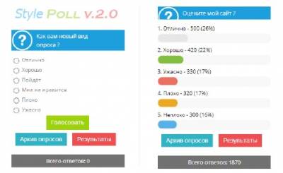 Новый цветной вид опроса второй версий включает в себя графический стиль с заменой цвета. не чего удивительного и нового почти нет, просто иное оформление и вывод в блок вашего сайта. У данного вида опроса, ширина полосы ответа нормальной длины.